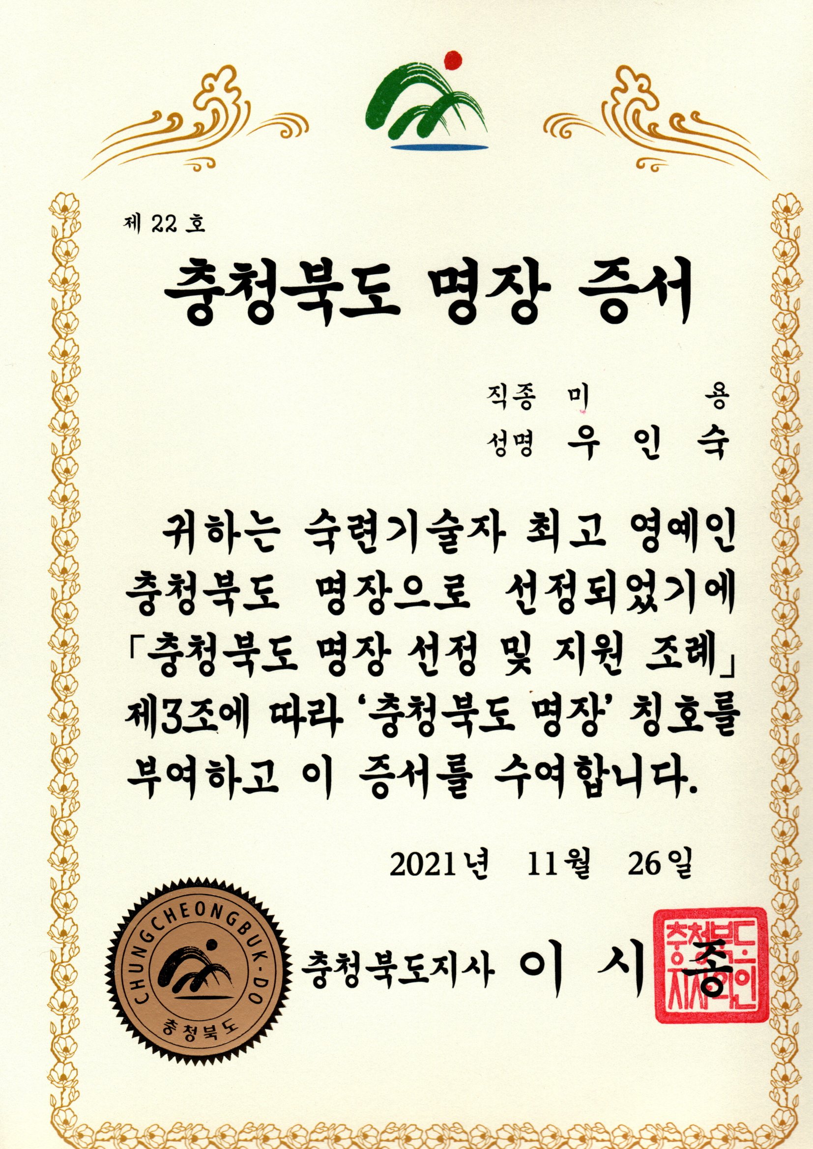 忠清北道工艺大师证书